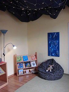 Kinder haben das Bedürfnis nach Rückzug. Ein Sternenhimmel, eine Couch, Kissen, Decken und ein großer Sitzsack laden im Lesezimmer zum gemütlichem Bücherlesen und zur Ruhe kommen ein. Dabei werden die Kinder in Ihren Sprachlichen und Kognitiven Kompetenzen geschult. Auf bequemen Schlafliegen findet von 13.00 bis 14.00 Uhr in diesem Zimmer die Mittagsruhe statt.